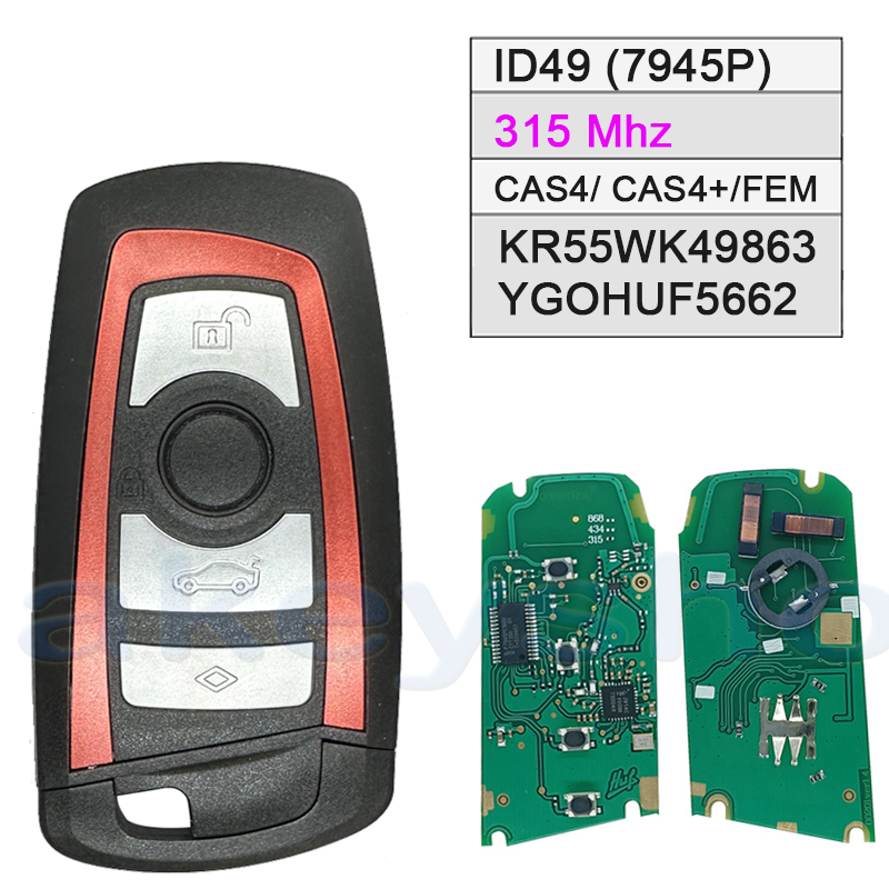 (KR55WK49863/YGOHUF5662) Cas4/ Cas4+/Fem 315Mhz ID49 (7945P) Chip, 4 Button, BMW Remote Control Key